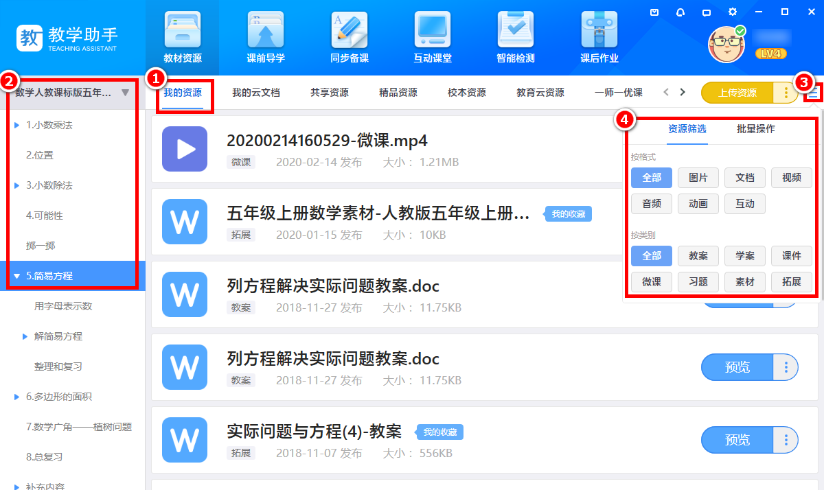 2.资源、课件收藏成功后,未选择对应章节。收藏的资源会自动保存在教材对应的章节目录下,选择”我的资源”,点击左侧“对应章节目录”,可在右侧点击筛选对应格式或类型的资源进行查找。