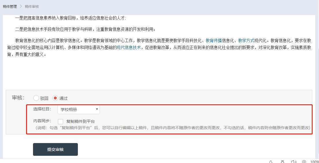 2.审核投稿为通过时,可以再次选择稿件的展示栏目、是否复制稿件到学校空间,勾选后,稿件内容将会被复制到学校空间,变为学校管理员可编辑的内容直接在学校空间里展示,如果不勾选,那么游客点击稿件后,会进入到稿件源头即原作者空间中浏览稿件内容,且学校管理员不可编辑。
