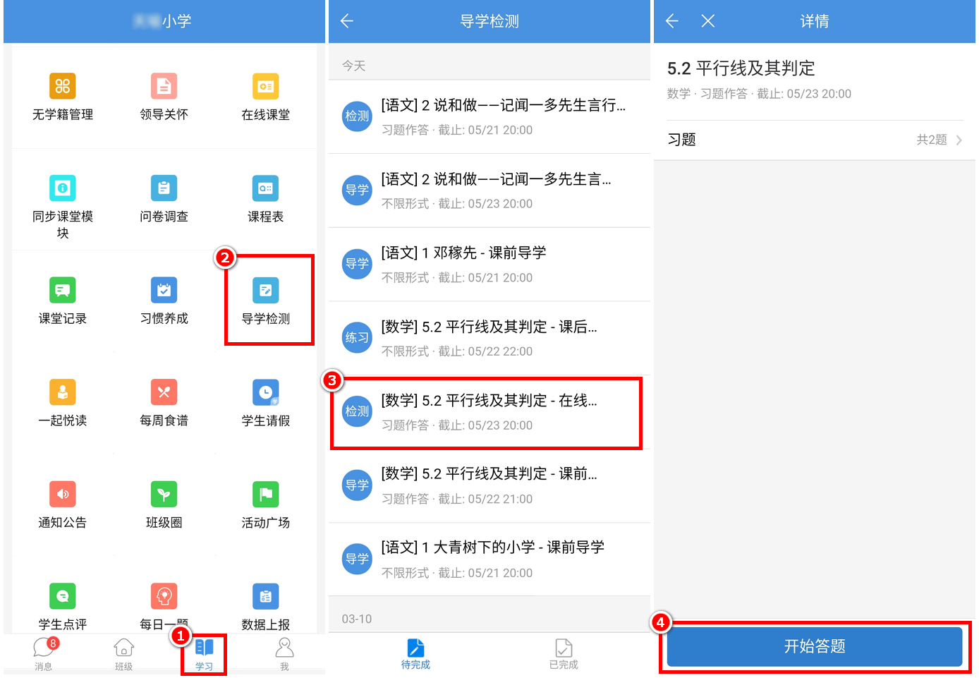 登录移动端APP,点击“学习”—“导学检测”,在“待完成”中找到需要完成的检测,点击“开始答题”即可开始作答。