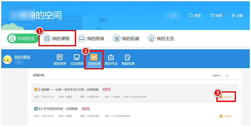 登录当地教育云平台,在“我的课程”中找到“在线检测”,点击“开始学习”即可开始答题。