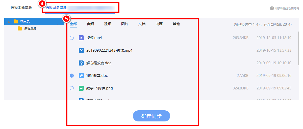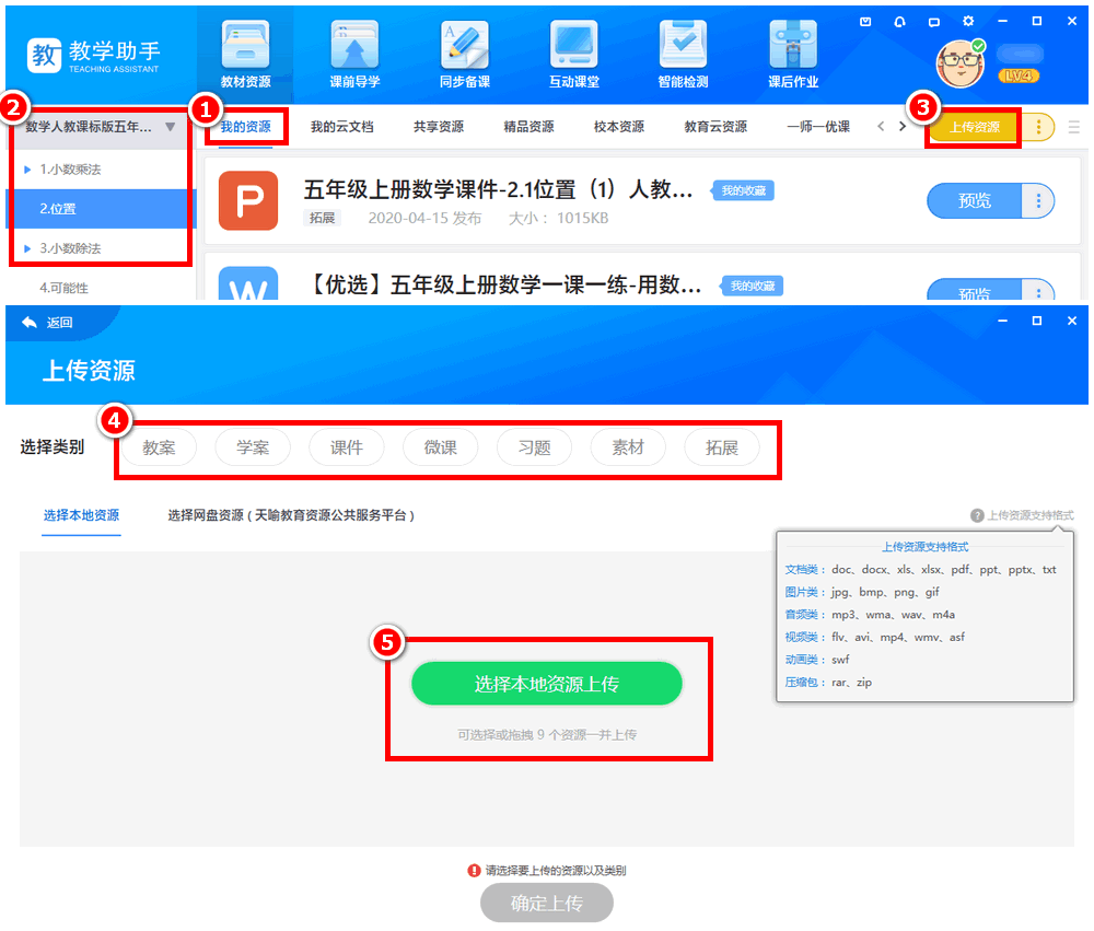 教师登录教学助手PC端,或登录当地教育云个人空间进入教学助手WEB端,点击“教材资源”-“我的资源”,在左侧选择教材版本、章节目录后,点击”上传资源“。上传资源时可选择类别以及本地上传或调取本地教育云平台网盘资源中的文件,点击“确定同步”可将文件同步至“我的资源”。