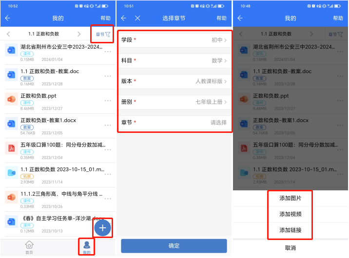 教师使用教育云账号登录APP,在底栏“工作”中找到“教材资源”,点击“我的”右上角选择对应的章节,选择完成后点击右下方的“+”按钮进行资源的添加即可,教师可添加图片、视频、链接形式的资源。