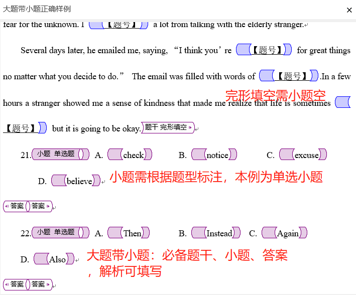 大题带小题是复合题型,常见如完形填空、阅读理解、短文填空、补全对话等。