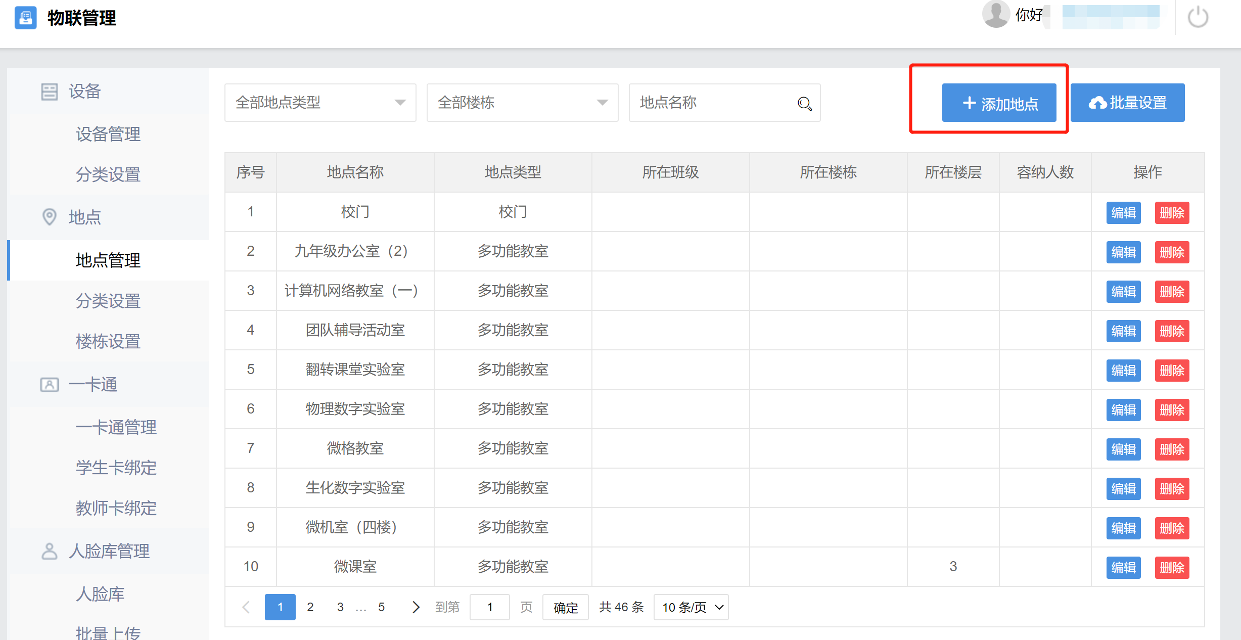会议地点在校内,但不在选择列表时,需进入“物联管理”应用,在“地点管理”中添加地点,添加地点完成后,在会议安排中即可选择到所需要的地点。
