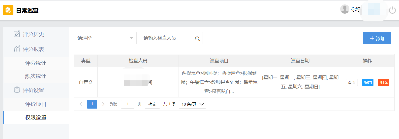 第一步:打开日常巡查-权限设置,点击“添加“按钮
