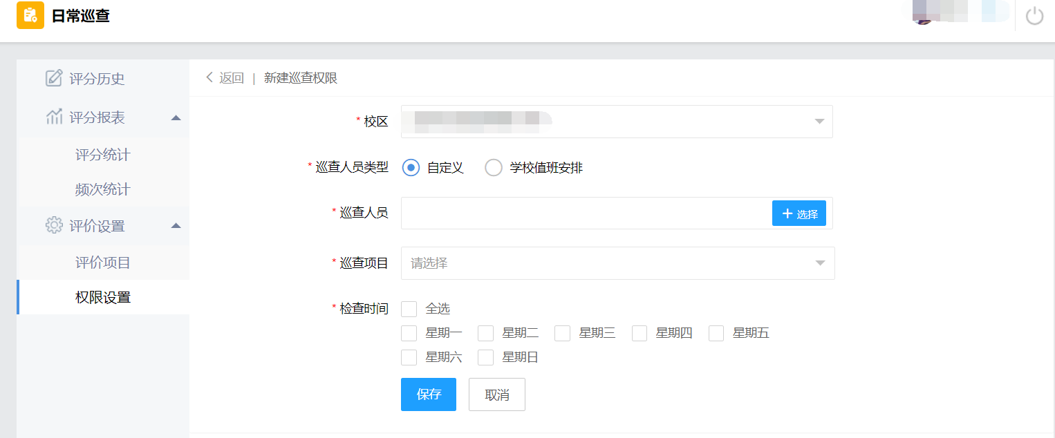 日常巡查项目设置(包括新增指标)后,需要对相关进行权限设置,权限设置完成后,相关老师打开移动端才能看到这个项目进行打分